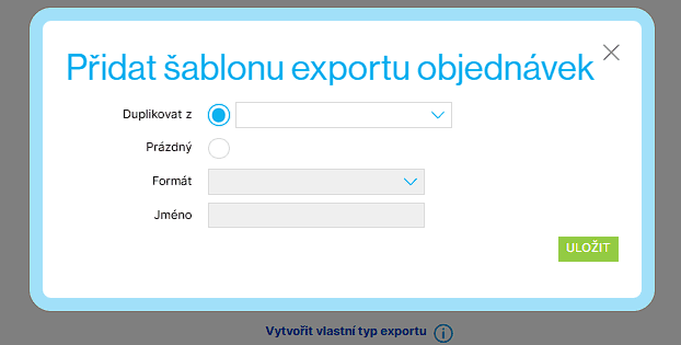 Klikneme na Vytvoriť vlastný typ exportu. Nastavíme na prázdnu CSV tabuľku a pomenujeme ju.