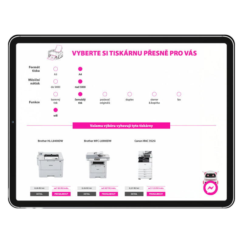 V případě, že zákazník neví, které parametry jsou pro něj důležité, může využít možnost chatbota. Ten jej provede procesem výběru tiskárny a na konci doporučí nejvhodnější zařízení. Pokud však výběr tiskárny návštěvníkovi nevyhovuje, může se v chatu obrátit přímo na odborníka, který mu s výběrem pomůže.