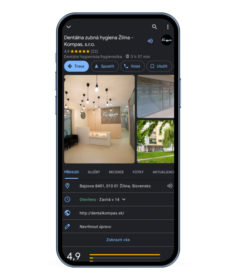 Kompletní aktualizací prošla také prezentace firmy na Google My Business, kde jsme vyplnili důležité údaje, přidali atraktivní fotky a nastartovali sběr recenzí. Statistiky totiž mluví jasně. Více než 90 % nových zákazníků se začte do recenzí, než o služby vůbec projeví zájem.